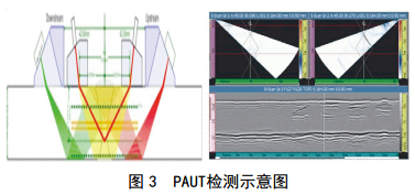 (3) PAUT檢測。使用微型探頭陣列產(chǎn)生超聲波束,通過(guò)建立聚焦規則使電子裝置控制每個(gè)陣列單元的發(fā)射和接收時(shí)間,從而產(chǎn)生出多個(gè)超聲波束,通過(guò)控制陣列的激發(fā)和接收時(shí)間,控制波束角度、聚焦深度、聚焦尺寸等,實(shí)現工件的快速掃描成像,如圖 3所示。