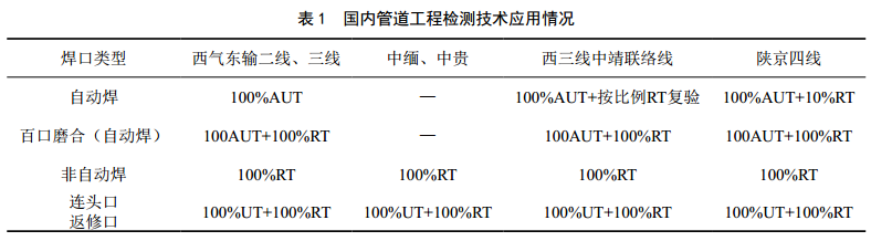 3.1 國內管道工程檢測技術(shù)應用情況(表 1)