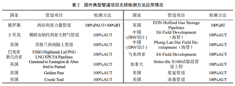 3.2 國外典型管道項目無(wú)損檢測方法應用情況(表 2)