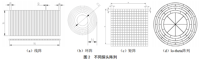 通常將一個(gè)大尺寸的探頭按規則分割成許多獨立小單元探頭的陣列,分為平面陣列和非平面陣列,其中平面陣列又細分為一維陣列(線(xiàn)陣和環(huán)陣)和二維陣列(矩陣和lo-theta陣列),如圖 2所示;非平面陣列主要是指柱面陣列[3]。