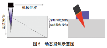超聲相控陣檢測技術(shù)一般通過(guò)控制參與波束形成的發(fā)射和接收探頭陣列單元以及對應每個(gè)單元的發(fā)射器和接收器的時(shí)間延遲規則和激勵電壓幅度來(lái)形成自己的聚焦法則[3]。目前主要采用動(dòng)態(tài)聚焦,如圖 5所示,超聲聲束沿聲束軸線(xiàn),在發(fā)射時(shí)使用單個(gè)聚焦脈沖,在接收時(shí)通過(guò)計算對所有深度進(jìn)行編程深度聚焦,實(shí)現對不同深度進(jìn)行聚焦掃描。最新技術(shù)是實(shí)時(shí)全聚焦(TFM)成像檢測, TFM是一個(gè)信號處理算法,利用全矩陣采集TFM的數據來(lái)對缺陷的位置及外形尺寸進(jìn)行精確成像。
