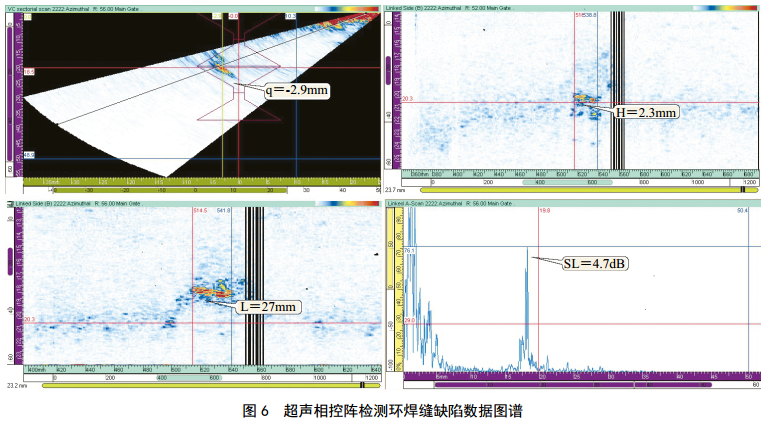 實(shí)際應用中,超聲相控陣檢測的工藝設置、全程掃查記錄等信息,將以多種形式呈現在屏幕上,顯示出各種缺陷供測量、分析。一般設置雙通道來(lái)采集數據, 結合S掃描、 B掃描及A型顯示,對缺陷的位置、深度、長(cháng)度進(jìn)行測量。圖 6所示為某環(huán)焊縫相控陣檢測缺陷數據圖譜,相比射線(xiàn)檢測和常規超聲檢測,數據顯示更加直觀(guān)明了,便于存儲和讀取。