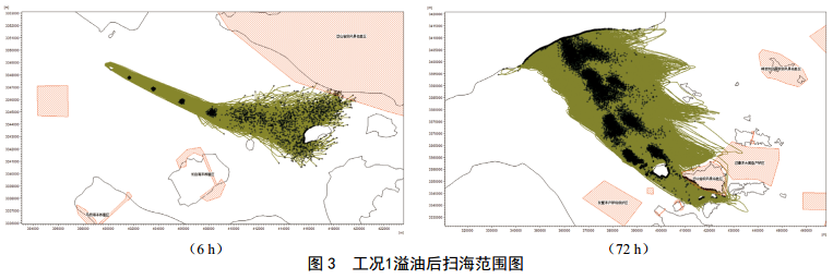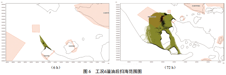 CB1發(fā)生溢油事故后,工況1(高平潮, SE風(fēng)向, 4.0 m/s風(fēng)速) 6 h掃海面積61.2 km2, 72 h后掃海面積為3 525.5 km2;工況3(高平潮, W風(fēng)向,10.8 m/s風(fēng)速) 6 h掃海面積195.7 km2, 72 h后掃海面積為8 026.8 km2(圖 5);工況4(高平潮, SW風(fēng)向, 10.8 m/s風(fēng)速) 6 h掃海面積93.8 km2, 72 h后掃海面積最大,為10 542.4 km2;工況6(高平潮, N風(fēng)向, 10.8 m/s風(fēng)速) 6 h掃海面積為8.2 km2, 72 h后掃海面積為759.5 km2(圖 6)。不同風(fēng)向對環(huán)境敏感區域溢油的響應時(shí)間各不相同,最快1 h溢油到達環(huán)境敏感目標區域,主要敏感目標中五峙山列島鳥(niǎo)類(lèi)自然保護區受影響最嚴重。