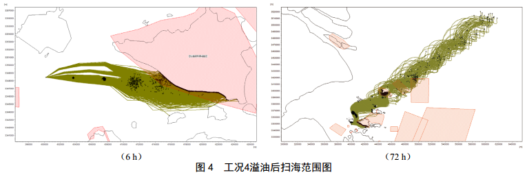 預測結果表明,由于周邊海島的阻隔作用,不同 風(fēng)向時(shí)溢油影響的差別較大。 YS2發(fā)生溢油事故時(shí),工況1(高平潮, SE風(fēng)向, 4.0 m/s風(fēng)速) 6 h掃海面積為63.0 km2, 72 h后掃海面積為3 582.3 km2(圖 3);工況3(高平潮, W風(fēng)向, 10.8 m/s風(fēng)速) 6 h掃海面積為195.7 km2, 72 h后掃海面積為8 026.8 km2;工況4(高平潮, SW風(fēng)向, 10.8 m/s風(fēng)速) 6 h掃海面積為75.5 km2, 72 h后掃海面積最大,為12 983.2 km2(圖 4)。不同風(fēng)向對環(huán)境敏感區域溢油響應時(shí)間各不相同,最快2 h溢油到達環(huán)境敏感區域,岱山省級風(fēng)景名勝區受影響最嚴重。