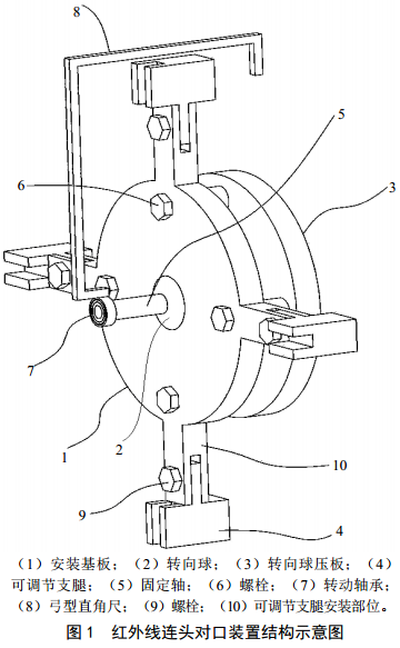 紅外線(xiàn)連頭對口裝置由安裝基板、轉向球、轉向球壓板和可調節支腿組成(圖 1)。四個(gè)可調節支腿等間距裝在圓形安裝基板四周。安裝基板與轉向球壓板之間設置有小孔,轉向球安裝在兩者之間,用螺栓連接。固定軸一端放置紅外線(xiàn)發(fā)射或接收器,另一端連接轉向球。固定軸內部安裝轉動(dòng)軸以使得其上連接的弓型直角尺可以通過(guò)旋轉劃線(xiàn)。