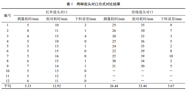 現場(chǎng)使用時(shí),首先將紅外連頭對口裝置安裝在兩段長(cháng)輸管道管口的圓心處,紅外線(xiàn)發(fā)射器與安裝在另一端管道的紅外線(xiàn)接收器相對。調整轉向球使紅外線(xiàn)直接照射在接收器上,固定紅外線(xiàn)發(fā)射器和接收器,使兩端管道管口圓心處在同一條直線(xiàn)上。分別在兩端管道使用弓型直角尺畫(huà)出切割標記線(xiàn),標記線(xiàn)圍成的圓形平面與紅外線(xiàn)相垂直,測量?jì)蓚(gè)平面之間的距離,即得出下料長(cháng)度。該裝置經(jīng)揭陽(yáng)維搶修隊用于DN 800閩粵支干線(xiàn)工程和揭陽(yáng)分輸站改擴建工程中,與傳統連頭對口測量方式對比(表 1),結果表明,使用該裝置能夠降低下料誤差,明顯縮短施工時(shí)間。