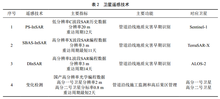 基于衛星遙感技術(shù)(表 2),在管道左右兩側0.1、0.5、2.5公里范圍開(kāi)展累計緩慢形變監測,實(shí)現管道沿線(xiàn)地質(zhì)災害早期識別,同時(shí)對管道周邊大范圍地質(zhì)變化情況進(jìn)行管控。采用國產(chǎn)高分辨率光學(xué)衛星對管道沿線(xiàn)進(jìn)行地物變化檢測統計及建筑物識別提取,查找人為因素導致的建筑用地變化區域,并做出相關(guān)分析,實(shí)現管道沿線(xiàn)施工監測和高后果區管理。