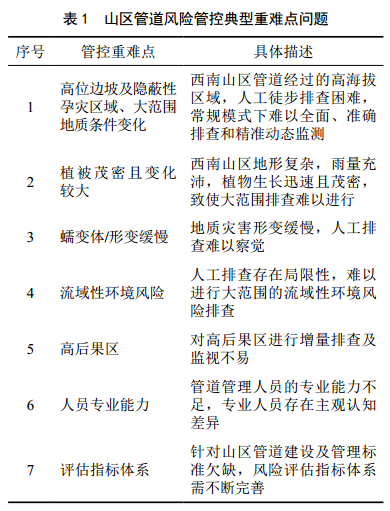 表 1為山區管道風(fēng)險管控典型重難點(diǎn)問(wèn)題。