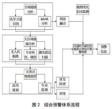 通過(guò)技術(shù)與管理相結合,建立天基系統、地基系統與地災風(fēng)險管控流程結合的天地聯(lián)合風(fēng)險管控體系,對地質(zhì)災害進(jìn)行“三查”(普(排)查、詳(篩)查、監查),實(shí)現地質(zhì)災害的天地一體化綜合監測預警,提高風(fēng)險管控能力和管控效率(圖 2)。