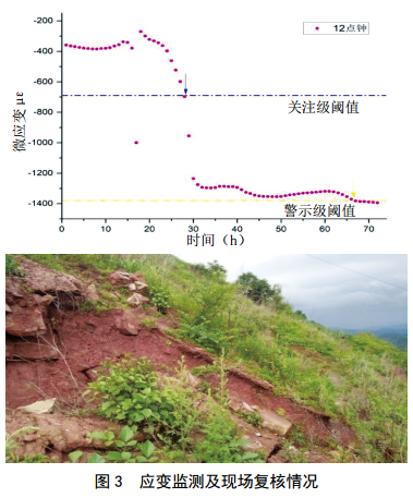 2018年8月13日,平臺監測到中緬管道K321滑坡1#應變監測點(diǎn)應變值出現穩步上升趨勢,抗滑樁出現輕微形變,系統預警。經(jīng)現場(chǎng)復核發(fā)現,持續降雨導致滑坡體第一排抗滑樁左側兩根樁上部管溝處出現小范圍局部滑塌(圖 3);鷧^呈圈椅狀,長(cháng)約15米,寬約8~12米,厚度約1.2米,滑塌區后緣下錯約 1.2米,邊緣下錯約0.4米,局部光纜外露,排水溝堵塞。公司及時(shí)趕赴現場(chǎng)復核,并采取消減措施降低了風(fēng)險。