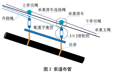 工法原理:在陡坡兩端各設一個(gè)塔架支撐承載索,卷?yè)P機牽引滑車(chē)布管裝置在索上行走輸送鋼管,同時(shí)設置卷?yè)P機收放雙提升繩升降鋼管。除用于布管外,索道還作為管道組對工具及其他材料的運輸工具(圖 2)。
