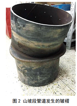 圖 1為臨近道路施工誘發(fā)山體滑坡,開(kāi)挖后的管道發(fā)生明顯移位。圖 2為某管道山地敷設段因滑坡而發(fā)生皺褶,引發(fā)了介質(zhì)泄漏。從山地管道失效案例可以總結管道失效原因:一是對管道受到的外部載荷估計不足,往往是管道發(fā)生事故之后,才意識到管道受到嚴重的載荷作用;二是管道的應變能力不足,土體擾動(dòng)即可能導致管道失效;三是管道的防護結構(如擋土墻等)保護能力不足,某些因素可能致其先行損壞,未能對管道起到足夠的防護作用。