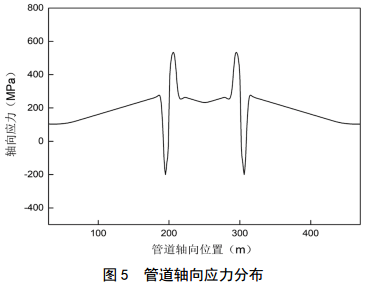 有限元分析得到管道的應力分布情況如圖 4及圖 5所示。從圖 4可以看到,在滑坡體與滑床過(guò)渡位置為應力突變處,管道A、B側的應力均發(fā)生了由受拉應力到受壓應力的轉變,該處位置是管道的危險段,如果管道的變形較大,可能會(huì )在該處發(fā)生斷裂。圖 5為從管道B側提取得到的軸向應力分布情況,從圖中可以看到,應力在滑坡體與滑床過(guò)渡位置發(fā)生顯著(zhù)變化。最大壓應力位于滑床區域,其值為200 MPa,最大拉應力位于滑坡體內,其值為528 MPa,此應力已經(jīng)超過(guò)管道屈服強度,發(fā)生塑性變形,應采取必要的措施降低管道受到的應力。