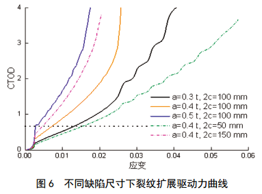 針對高鋼級管道環(huán)焊縫斷裂問(wèn)題,筆者建立了基于應變的斷裂評價(jià)方法[5],包括管道環(huán)焊縫局部力學(xué)性能測試、基于損傷的管道環(huán)焊縫有限元模型、管道斷裂韌性的約束校正等,定量管道環(huán)焊縫的應變能力。在基于應變的斷裂分析中,采用裂紋尖端張開(kāi)角(CTOD)作為參數描述裂紋擴展驅動(dòng)力和裂紋擴展阻力。圖 6是裂紋擴展驅動(dòng)力曲線(xiàn),隨著(zhù)缺陷長(cháng)度2 c(分別取值50 mm、100 mm、150 mm)及缺陷深度a(分別取值0.3 t,0.4 t,0.5 t)的增大,曲線(xiàn)不斷左傾,且斜率越來(lái)越大,表明環(huán)焊縫的應變能力隨缺陷尺寸的增大而逐漸減小。