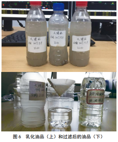 據此,大理站開(kāi)展現場(chǎng)實(shí)驗,使用濾紙過(guò)濾乳化油品,乳化現象明顯消除(圖 6)。根據實(shí)驗結果,建議下游銷(xiāo)售公司將罐內油品靜置5~7天,乳化現象基本消除。