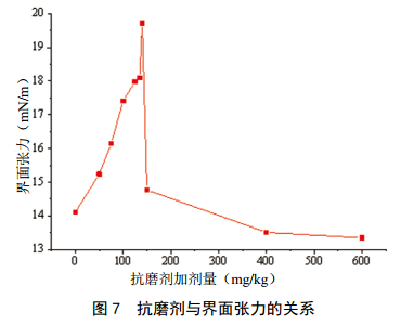 為了定量分析抗磨劑對柴油乳化成因,開(kāi)展了相關(guān)研究。從圖 7可以看出,投產(chǎn)所用柴油的界面張力隨著(zhù)抗磨劑加入量的增加,先升高后降低,界面張力最大點(diǎn)處正是實(shí)際管輸柴油中抗磨劑加入量處。