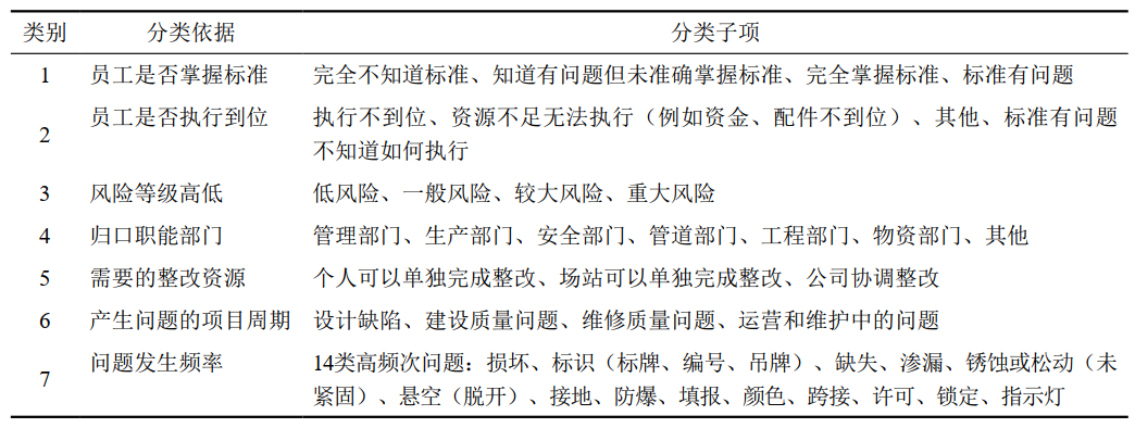 結果表明,14類(lèi)高頻問(wèn)題占總問(wèn)題量的78%,排名前八位的依次為:損壞、標識(標牌、編號、吊牌)、缺失、滲漏、銹蝕或松動(dòng)(未緊固)、懸空(脫開(kāi))、接地、防爆。因此,針對重點(diǎn)突出問(wèn)題,精準施策,是整治工作的重要突破口。