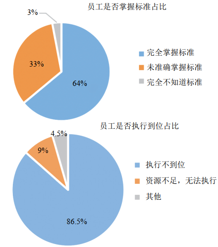 圖 2結果表明,64%的問(wèn)題員工已完全掌握處理標準,33%知道有問(wèn)題、未準確掌握標準,說(shuō)明絕大部分“低老壞”問(wèn)題都是員工能力范圍之內可以避免的。執行不到位占比高,說(shuō)明員工工作態(tài)度不積極是產(chǎn)生問(wèn)題的主要原因。