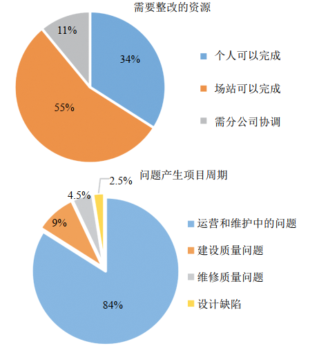 圖 4結果表明,55%為場(chǎng)站可以單獨完成整改的問(wèn)題,應以提高場(chǎng)站管理水平為主要抓手!暗屠蠅摹眴(wèn)題主要發(fā)生在運營(yíng)和維護階段,需要采取措施提高管理水平。