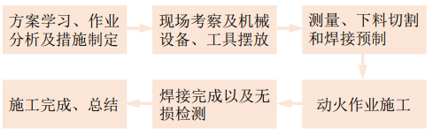 換管作業(yè)前組織所有作業(yè)人員認真溫習焊接工藝規程和焊接作業(yè)方案,將焊接作業(yè)流程熟記于心。掌握各自工作范圍、職責及作業(yè)內容,每個(gè)步驟或工序標準及驗收要求,合理分組并列出所需施工設備、工具和檢測器具(圖 1)。