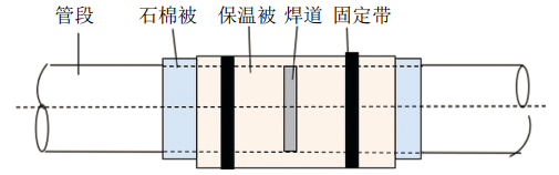 當環(huán)境溫度低于5℃時(shí),為了防止焊道急驟降溫而破壞焊縫性能,在焊道上加蓋保溫被使焊縫緩慢降溫。如有條件可將石棉被加熱到80℃以上,然后立即將清理完成的焊口趁熱裹上并蓋上保溫毯,再用橡皮帶捆緊,確保焊縫性能(圖 3)。