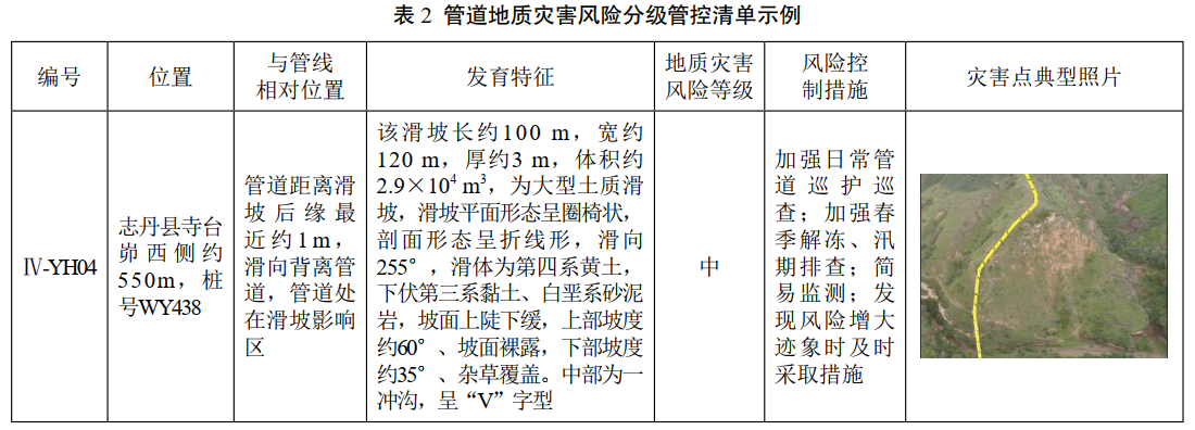 對識別出的地質(zhì)災害風(fēng)險點(diǎn),參照SY/T 6828―2017《油氣管道地質(zhì)災害風(fēng)險管理技術(shù)規范》,結合災害易發(fā)性、管道易損性和失效后果三項評價(jià)內容,進(jìn)行單體風(fēng)險評價(jià),建立“一圖一清單”,如圖 1、表 2所示。建立管道地質(zhì)災害風(fēng)險管理數據庫,形成一套適用于公司管道特點(diǎn)的地質(zhì)災害風(fēng)險管理企業(yè)標準,實(shí)施管道地質(zhì)災害風(fēng)險分級管控,實(shí)現由粗放型管理向精細化管理轉變。