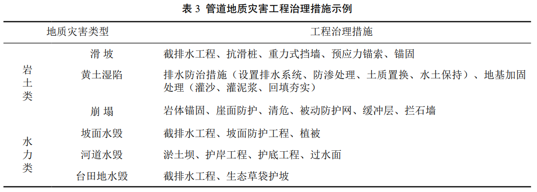 根據不同災害類(lèi)型、規模、工程地質(zhì)條件、水文地質(zhì)條件等選擇合適的工程治理措施。在保證管道安全運營(yíng)的同時(shí),注重治理工程投入的經(jīng)濟性。從2018年至2020年分批次投資5000余萬(wàn)元,有計劃地實(shí)施管道地質(zhì)災害治理,由過(guò)去的不足維護、過(guò)剩維護并存轉變?yōu)橐暻榫S護,有效防范化解油氣管道地質(zhì)災害風(fēng)險。工程治理措施示例見(jiàn)表 3。