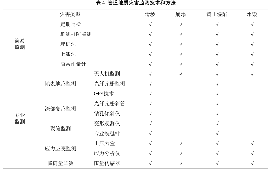 地質(zhì)災害風(fēng)險管理由傳統的事后處置逐步向事前預防預警轉變。通過(guò)對災害體與管體實(shí)時(shí)監測、自動(dòng)采集、邊緣計算、智能分析等,實(shí)現監測預警信息實(shí)時(shí)交互,對災害體發(fā)展與管道的安全運行狀態(tài)做出快速、準確的判斷和響應,為生產(chǎn)運行、安全管理、應急響應提供決策依據。管道各類(lèi)地質(zhì)災害監測技術(shù)和主要方法如表 4所示。