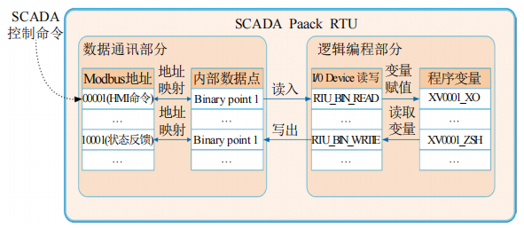 (1)RTU功能結構。清管站 RTU將功能分為相對獨立的兩部分,即完成數據通訊和邏輯編程,分別使用 SCADAPack E Configurator 和 SCADAPack Workbench 兩個(gè)軟件進(jìn)行配置和編程。如圖 3所示,數據在通訊部分和邏輯編程部分的傳送,讀、寫(xiě)是單向的。讀、寫(xiě)函數配置完成后,不能對同一地址點(diǎn)既讀又寫(xiě)。