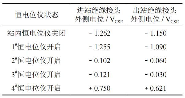 逐個(gè)開(kāi)啟站內恒電位儀,測試進(jìn)出站絕緣接頭外側電位,分析治理措施實(shí)施后區域陰極保護系統對站外管道的雜散電流干擾情況,測試結果見(jiàn)表 4。在開(kāi)啟站內4路恒電位儀時(shí),進(jìn)出站管道的電位變化不明顯,表明采用分布式淺埋陽(yáng)極對干線(xiàn)管道的干擾影響小。