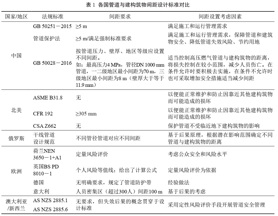 通過(guò)對比國內外標準,發(fā)現不同國家在設計階段對管道與建構筑物的間距要求、間距設置原則、考慮因素等均存在差異,國際上并沒(méi)有統一標準。對比主要結果見(jiàn)表 1。