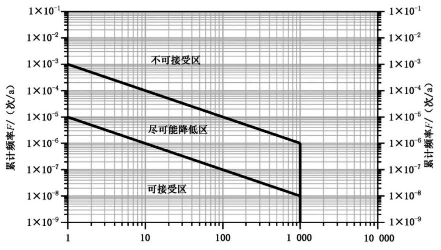 社會(huì )風(fēng)險表示特定防護目標多人死亡的事故累計頻率,也就是群體死亡的頻發(fā)程度。通過(guò)兩條風(fēng)險分界線(xiàn)將社會(huì )風(fēng)險劃分為三個(gè)區域,即:不可接受區、盡可能降低區和可接受區,詳見(jiàn)圖 1。