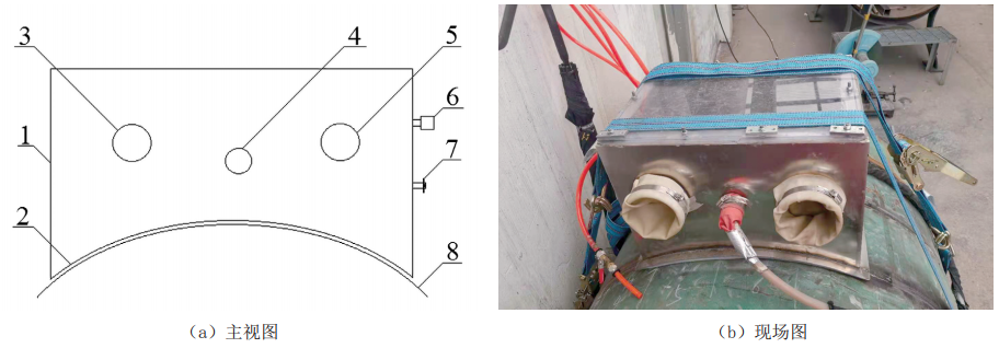 為保證焊接人員不影響操作箱體的密封性能,操作箱體開(kāi)設第一操作孔、第二操作孔及密封容置孔。第一操作孔和第二操作孔分別連接密封手套,從箱體外側將密封手套伸入箱內,執行焊接操作,并保證過(guò)程中箱體內外隔離。密封容置孔內設置焊接設備密封件,箱外側設置焊槍密封管,用于密封氬弧焊槍或者附屬線(xiàn)纜等。第一操作孔箱體外側和第二操作孔箱體外側分別設置過(guò)渡管,密封手套尾部通過(guò)環(huán)箍固定在過(guò)渡管上,穩定固定,可在高密封條件下順利實(shí)現焊接操作。為準確把握焊接時(shí)機和便于拆卸,操作箱體上設置了氣壓表和泄壓閥。