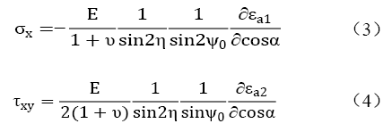 假定試樣表面平面應力狀態(tài)下,表面法線(xiàn)方向的剪切應力τ13、τ23為零,即殘余應力的計算表述為: