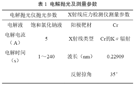 基于cosα法的X射線(xiàn)衍射檢測技術(shù),采用u-X360便攜式X射線(xiàn)應力檢測儀。管道表面處理采用電解拋光儀,電解拋光及測量參數見(jiàn)表 1。