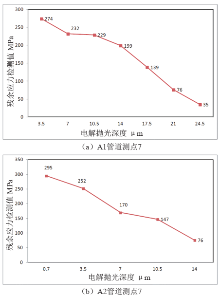 選取A1、A2管道測點(diǎn)7(圖 2)。對不同電解拋光時(shí)間下的表面應力進(jìn)行檢測。由圖 4可以看出,所測應力隨電解拋光時(shí)間延長(cháng)成梯度降低趨勢,實(shí)際反映了管體表面不同深度的應力大小。管體應力變化最劇烈的位置多在管體表面或近表層。管道因地基沉降產(chǎn)生較大附加應力、制造過(guò)程產(chǎn)生的殘余應力所引起的顯著(zhù)應力梯度,都集中于表層或近表層。