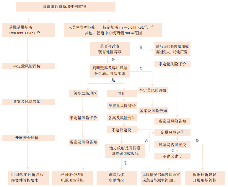 公司開(kāi)展周期性管道周邊規劃信息收集,預先識別高后果區新增及存量變化情況。當管道附近新增建構筑物足以改變現有地區等級,或導致原有高后果區增長(cháng)(包括長(cháng)度增長(cháng)、特定場(chǎng)所形成或常住人口數量增加等情況),或新增易燃易爆場(chǎng)所時(shí),要通過(guò)影響分析、風(fēng)險消減、備案及風(fēng)險告知、定量風(fēng)險評價(jià)、實(shí)施管控等五個(gè)環(huán)節開(kāi)展管理工作。風(fēng)險評價(jià)報告請縣級以上地方政府管道保護主管部門(mén)牽頭組織審查。對于風(fēng)險評價(jià)為不可接受的管段,向當地政府請示匯報,主動(dòng)協(xié)調重新選址或調整布局。對于風(fēng)險評價(jià)為可接受的管段,通過(guò)協(xié)商近管道一側土地規劃布局及用途等,減少雙方的相互疊加風(fēng)險,降低管道事故狀態(tài)對周邊人員和財產(chǎn)的潛在后果影響。對于風(fēng)險評價(jià)需要采取措施方可接受的管段,通過(guò)實(shí)施腐蝕防護、管道環(huán)焊縫專(zhuān)項整治、地質(zhì)災害防治、第三方施工防控、安全保衛等措施,并優(yōu)化管道周邊用地性質(zhì)以降低風(fēng)險。具體流程如圖 1所示。
