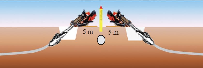 一要管住位置,做到能不交叉就不交叉,盡量增大并行間距,努力爭取對方調整優(yōu)化施工方案。交叉施工的最優(yōu)方案是在交叉處人工開(kāi)挖,再在管道兩側作為起點(diǎn)向兩邊實(shí)施定向鉆(圖 2)。二要管住距離,碰到必須交叉或并行的定向鉆施工,必須管住距離,交叉間距和并行間距必須同時(shí)滿(mǎn)足標準規范安全間距和施工安全間距要求。三要管住鉆頭,決不輕信施工方所說(shuō)的精準定向鉆工藝,必須在劃定的安全間距范圍內設置超過(guò)管道埋深的鋼板樁或觀(guān)察坑,避免鉆頭偏離導線(xiàn)誤傷管道。