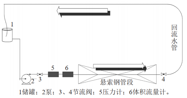 相似實(shí)驗平臺見(jiàn)圖 2,主要由介質(zhì)循環(huán)系統和數據測試系統兩部分組成。介質(zhì)循環(huán)系統包括介質(zhì)儲存罐1、離心泵2、節流閥3、壓力計5、體積流量計6、節流閥4和回水管。由于懸索跨越管道具有對稱(chēng)性,取管道中心為軸向原點(diǎn),沿介質(zhì)流向為正,逆介質(zhì)流向為負,實(shí)驗管路前端設計流量控制回路,用于調節管內介質(zhì)流速。數據測試系統包括若干光纖光柵應變傳感器、數據傳輸線(xiàn)和數據采集儀。