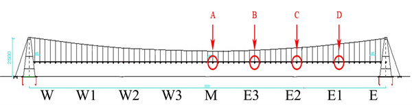 在懸索跨越實(shí)驗平臺單側管體上等距離選擇4個(gè)測點(diǎn),分別測試管體環(huán)向4個(gè)方向的微應變情況。每個(gè)測點(diǎn)分別布設4個(gè)傳感器(上、下、北、南),以及溫度補償傳感器。根據對稱(chēng)原理,全橋共獲取7個(gè)等間距位置的應變數據,如圖 3所示。
