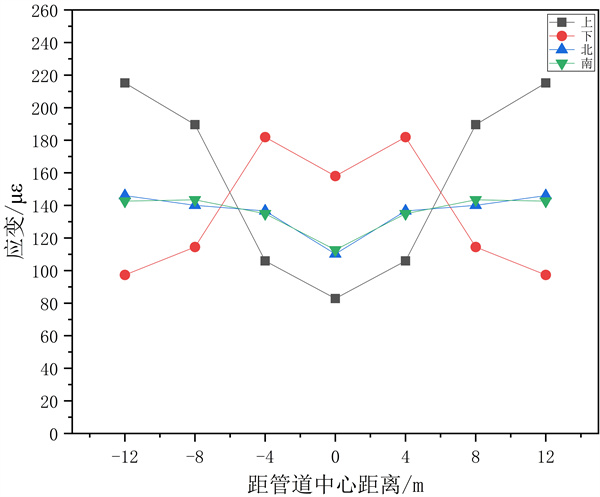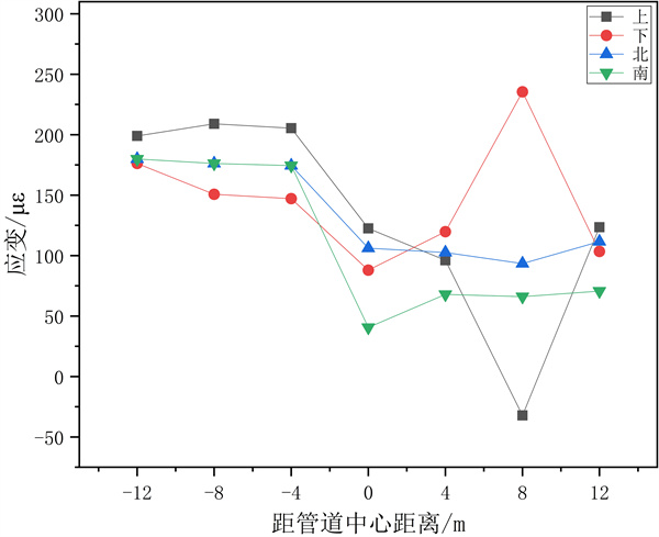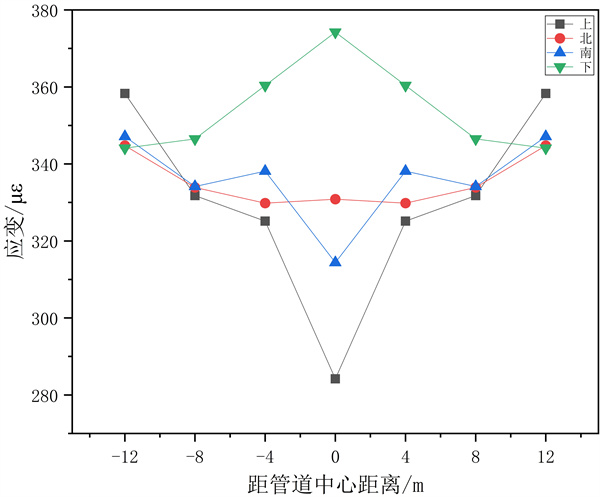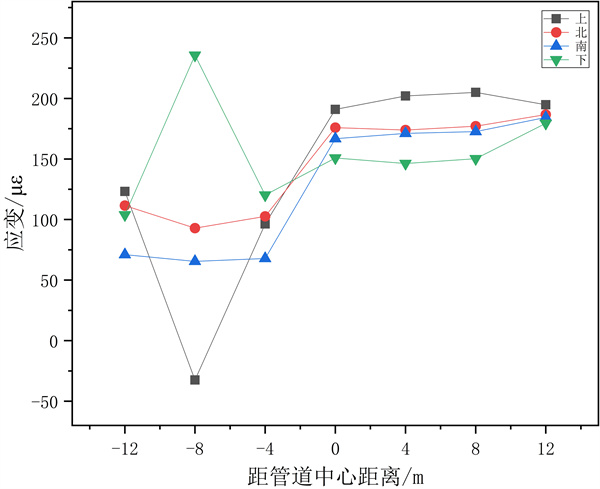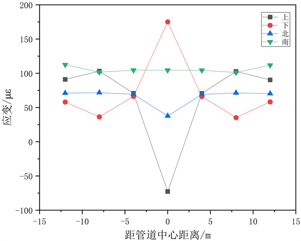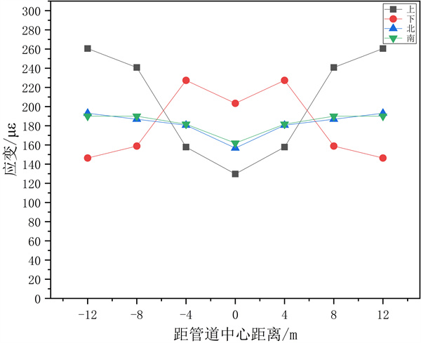 集中載荷F3作用條件下,最大應變值240με,在距管道中心﹣8 m位置處,即管道1/4處。管道開(kāi)始端比結束端應力值小,與無(wú)集中載荷作用時(shí)相比,管道中點(diǎn)的應變值略微增大,而管道開(kāi)始端的應變值則變小,結束端則變大。
