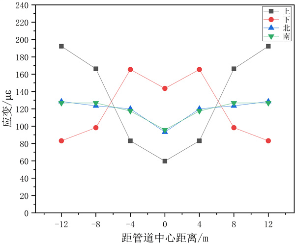 如圖 5至圖 7所示,最大應變值均出現在管道兩端上側,測點(diǎn)上、北、南三處最小應變值均在距管道中心處。管道下側最大值出現在管道的3/8位置處和5/8位置處。另外,管道上方中點(diǎn)的應變值最小。從圖中還可看出,在不同運行條件下,管道兩側變形應力基本相同,受外力作用影響較小。管道本體主要受到懸索跨越結構的拉力及管道自身的重力作用,管橋的下部在整個(gè)懸索跨越結構的中間位置變形最明顯。相反,管橋中部的管道本體上側會(huì )受到較為明顯的壓縮變形作用。