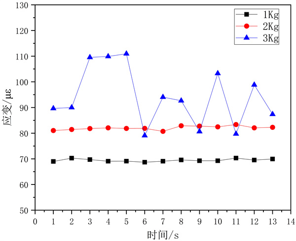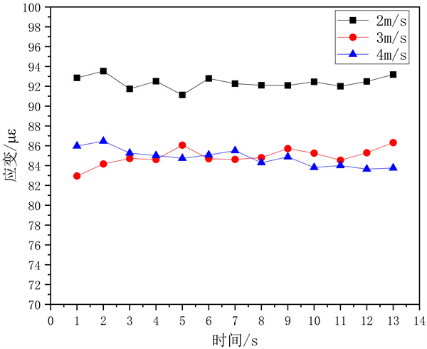 分別開(kāi)展風(fēng)載及橫向拉力條件下的應變實(shí)驗,測試各點(diǎn)應變值。從圖 12可以看出,隨著(zhù)風(fēng)速的增大,懸索管橋的應變波動(dòng)更明顯,由于風(fēng)載作用的波動(dòng)性,使得局部應力數值較小。由于實(shí)驗中風(fēng)載作用面積有限,實(shí)際懸索管橋受到河面橫風(fēng)的作用產(chǎn)生的應力波動(dòng)更為明顯。從圖 13可知,拉力作用產(chǎn)生的應力波動(dòng)隨拉力增大而增大,相比風(fēng)載變化更為穩定。當拉力載荷為3 kg時(shí),懸索跨越管橋應力波動(dòng)明顯增大。