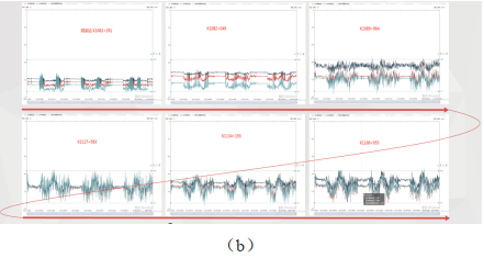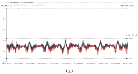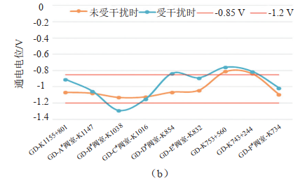 圖 3為某山區管段連續監測的管道通/斷電電位隨時(shí)間變化曲線(xiàn)。從圖 3(a)可以看出,管段受到典型的動(dòng)態(tài)雜散電流干擾而電位波動(dòng),每天夜間管道電位波動(dòng)消失。根據管段附近用電設施調查,可以判斷雜散電流來(lái)源為管道附近企業(yè)用電設備。圖 3(b)為管段K1062-K1168陰保監測的曲線(xiàn)圖,可以看出越向下游方向,監測點(diǎn)的波動(dòng)幅度越大,可以肯定雜散干擾也越大。