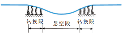 b)懸空段和轉換段的力學(xué)模型示意圖