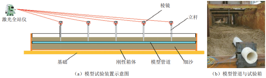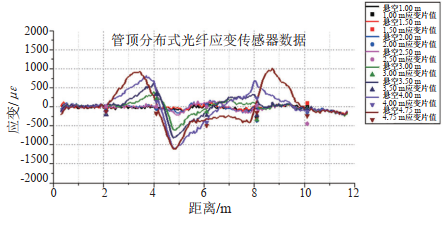 按照圖 2所示的位置將分布式光纖應變傳感器固定在管道上,同時(shí)為了進(jìn)行數據比對,在管道底部增設了1條分布式光纖應變傳感器,共沿管道長(cháng)度方向平行布設了4條分布式光纖傳感器。同時(shí)為了保證光纖監測數據的可靠性,也在模型管道的1/6、1/3、1/2、2/3、5/6長(cháng)度處,在管頂和管底分別等間距布設電阻應變片。在這些位置上,也布置了輕質(zhì)剛性立桿,作為管道關(guān)鍵斷面的變形監測靶點(diǎn),通過(guò)激光全站儀觀(guān)測不同試驗工況下管道的變形狀態(tài)。