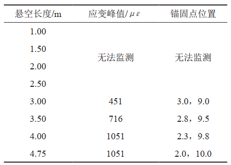 2 懸空管道管底應變峰值與兩側錨固點(diǎn)位置