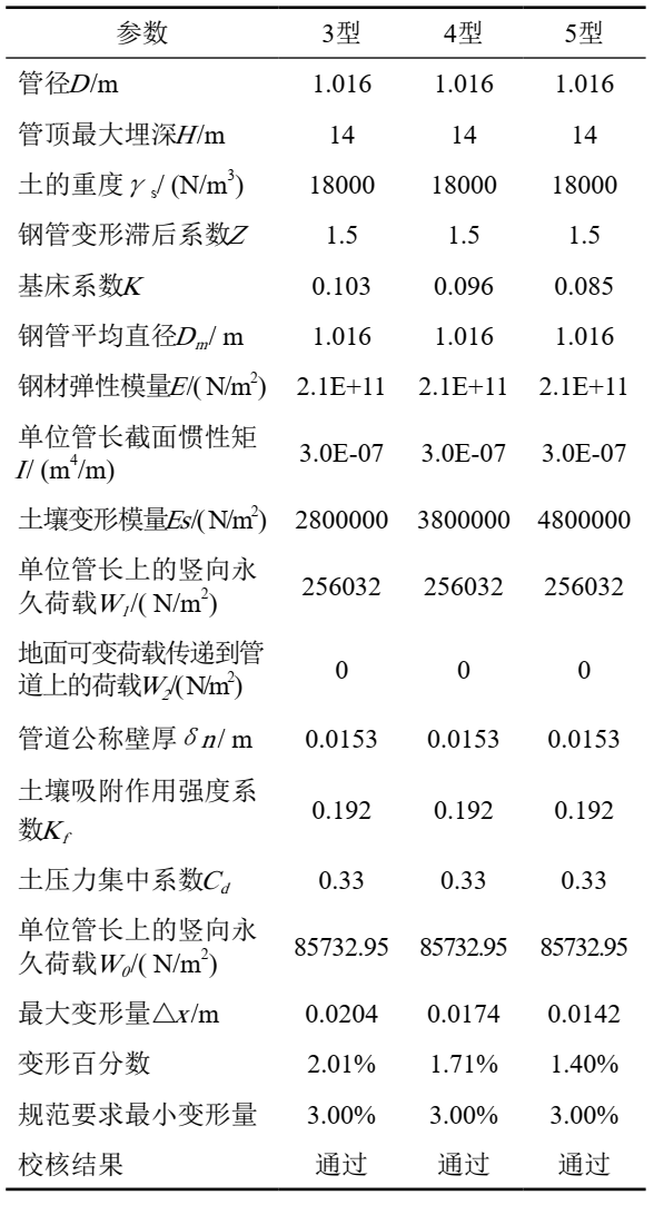 通過(guò)馬斯頓模型計算可知,在各種敷設條件下,管道最大變形值為2.01%,小于規范 3%變形允許值,管道徑向穩定性滿(mǎn)足安全要求。