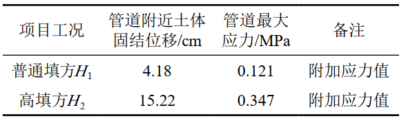 由于管道下部欠固結土的不均勻沉降,將引起其中敷設管道的受力不均。對于填方4 m(H1)和14 m(H2)的土體,其沉降值有明顯差異,如表 2所示。本文采用有限元計算方法(圖 2),計算不同高度回填土的土體沉降值和由此產(chǎn)生的管道附加應力值。