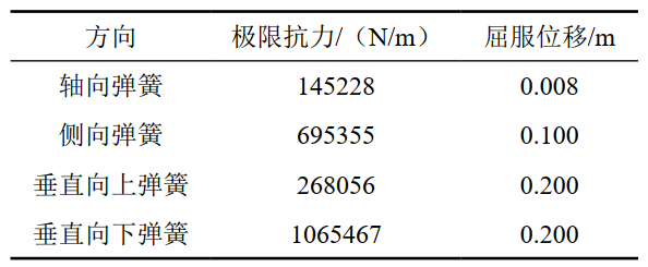 GB/T 50470―2017《 油氣輸送管道線(xiàn)路工程抗震設計規范》附錄E “通過(guò)活動(dòng)斷層埋地管道有限元方法的彈簧參數”規定,根據土體的特性確定土彈簧具體參數,按照管道軸向、水平側向和豎向三個(gè)方向考慮土體與管道的相互關(guān)系,表 3列出土彈簧極限位移和對應的土作用力值。